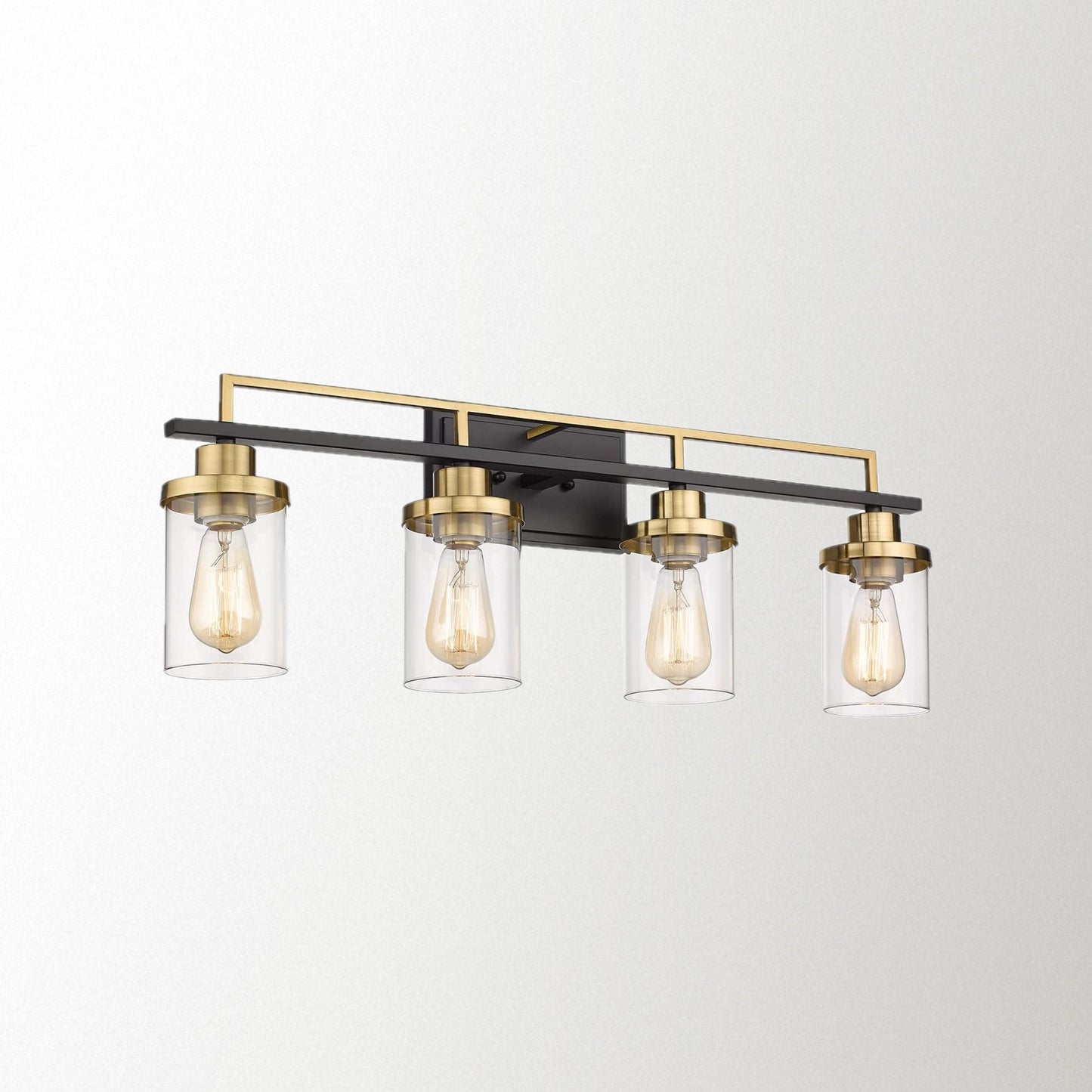 - Modern 4-light vanity light fixture features sturdy metal construction in black and gold finish with clear glass shade