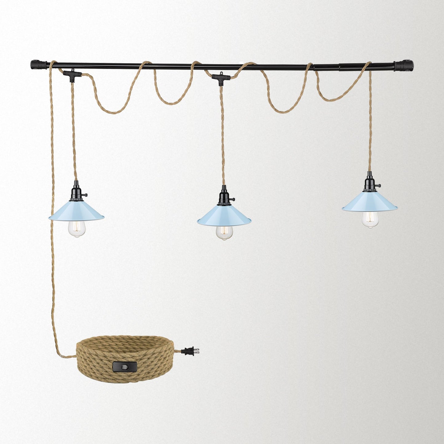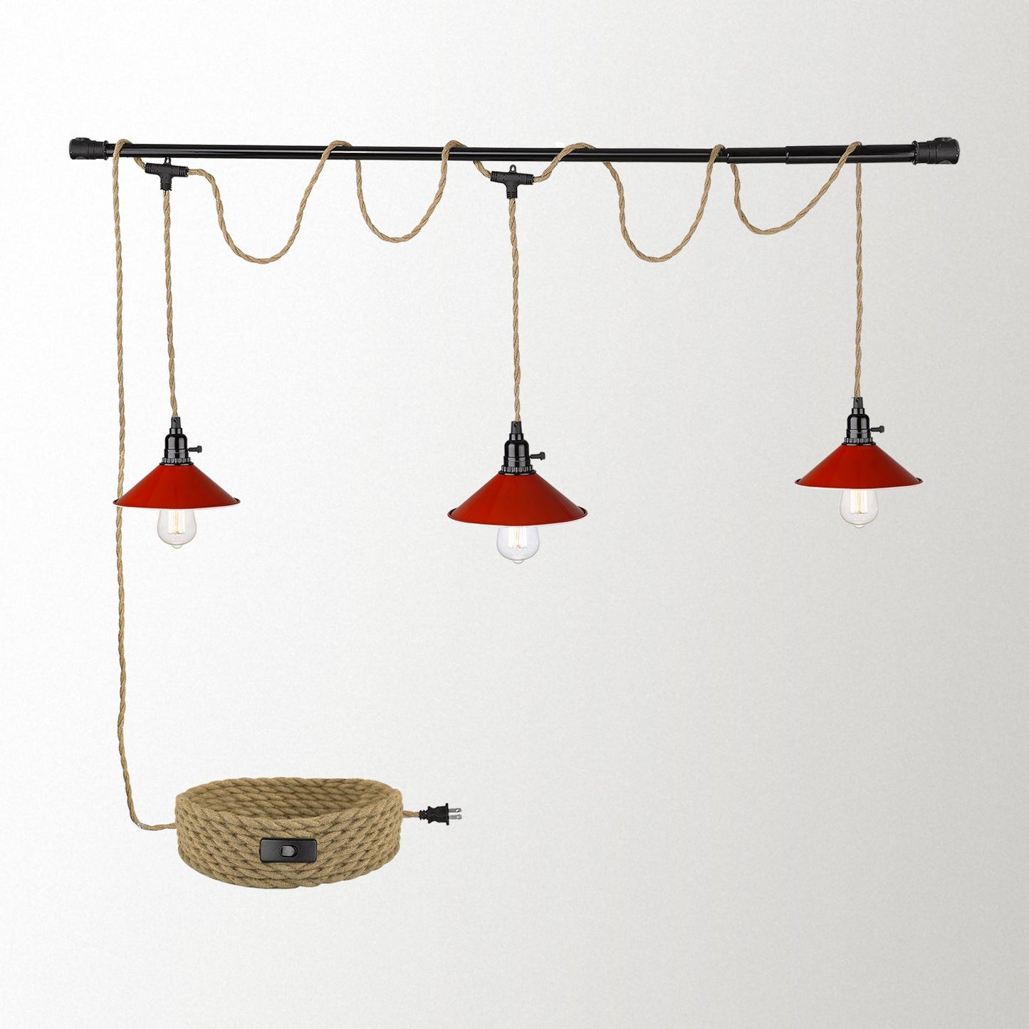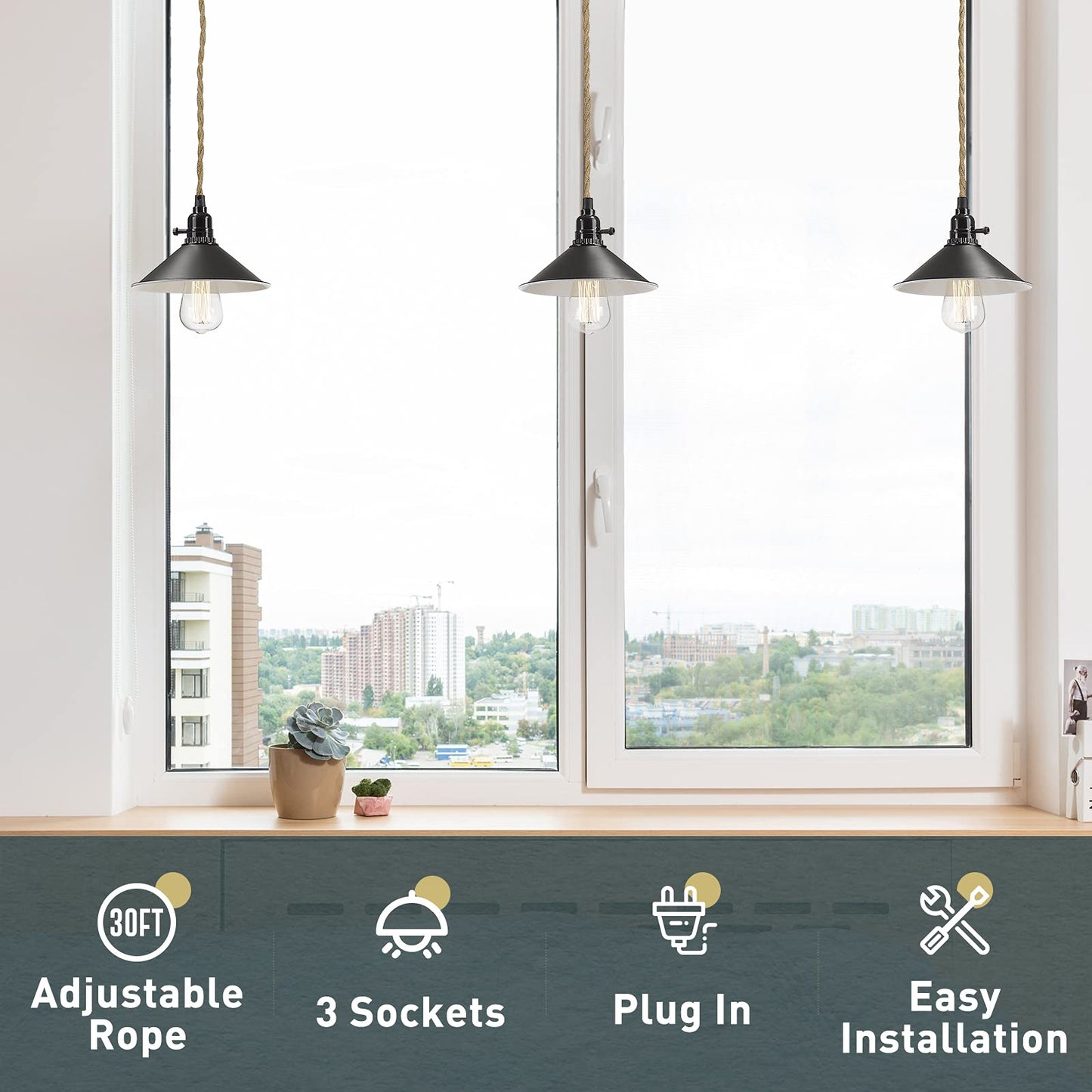- Farmhouse 3-light hanging light with plug in cord features 3 metal shades in a black finish, with 29FT adjustable twisted hemp rope to suit the needs of your space