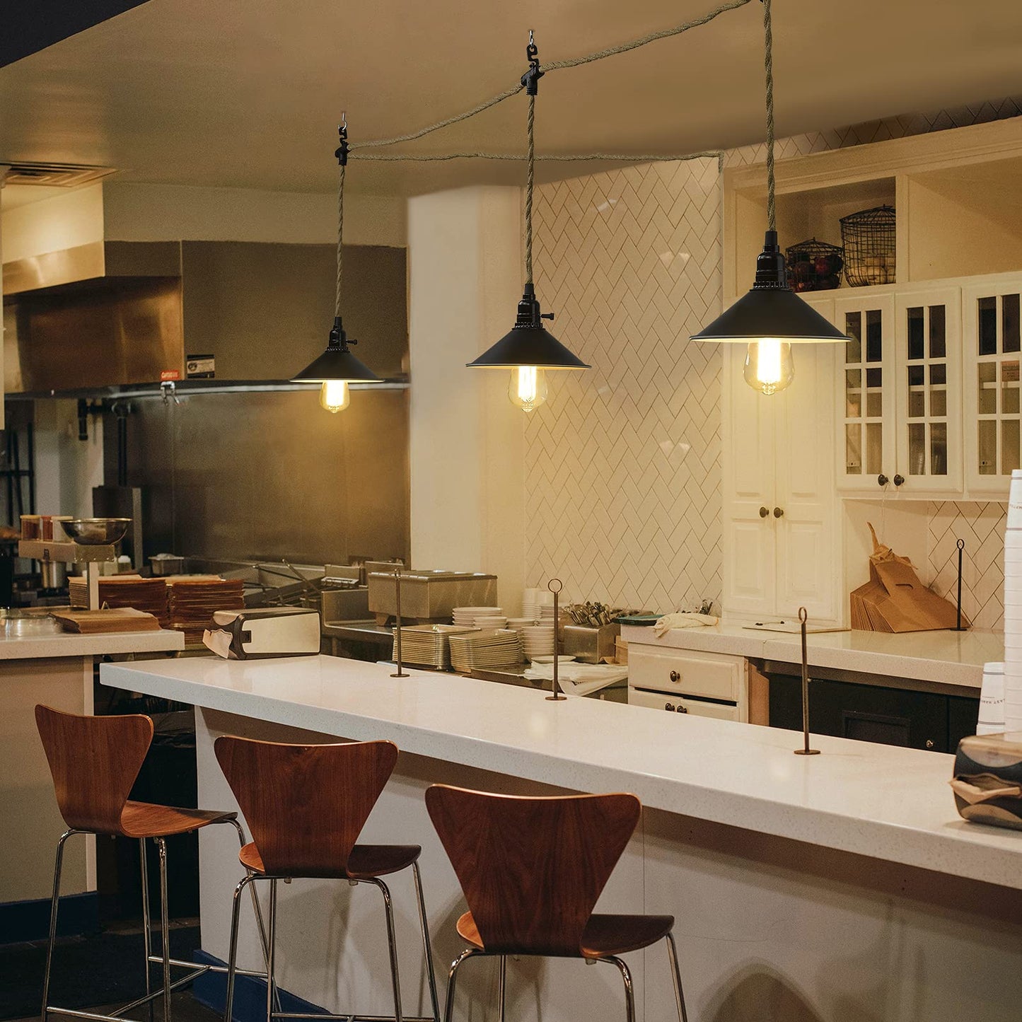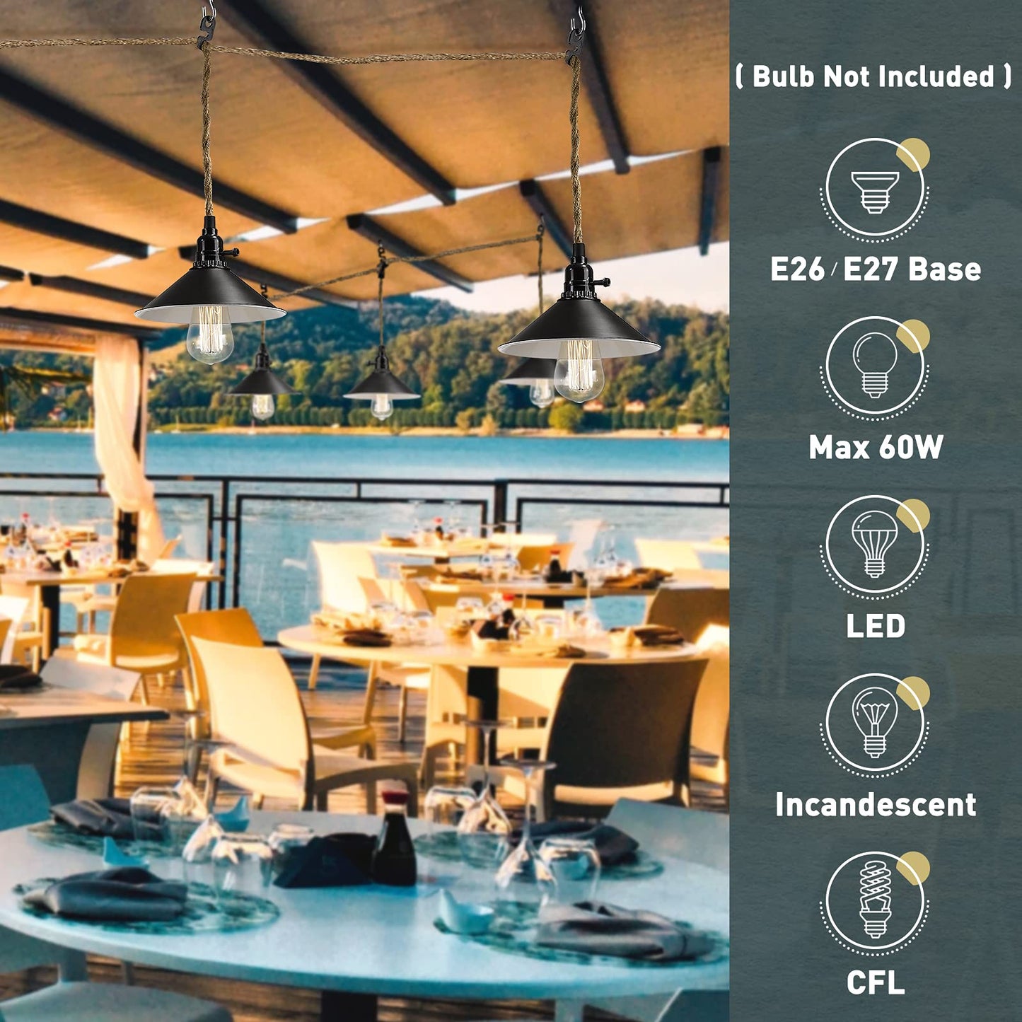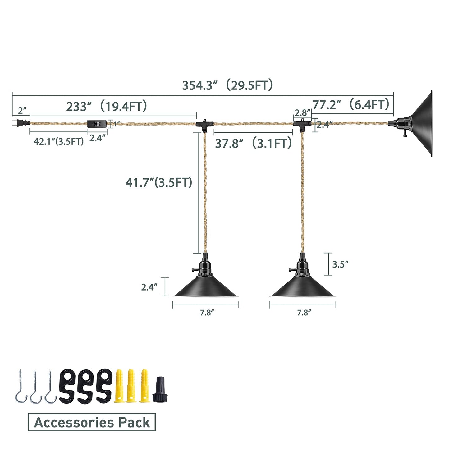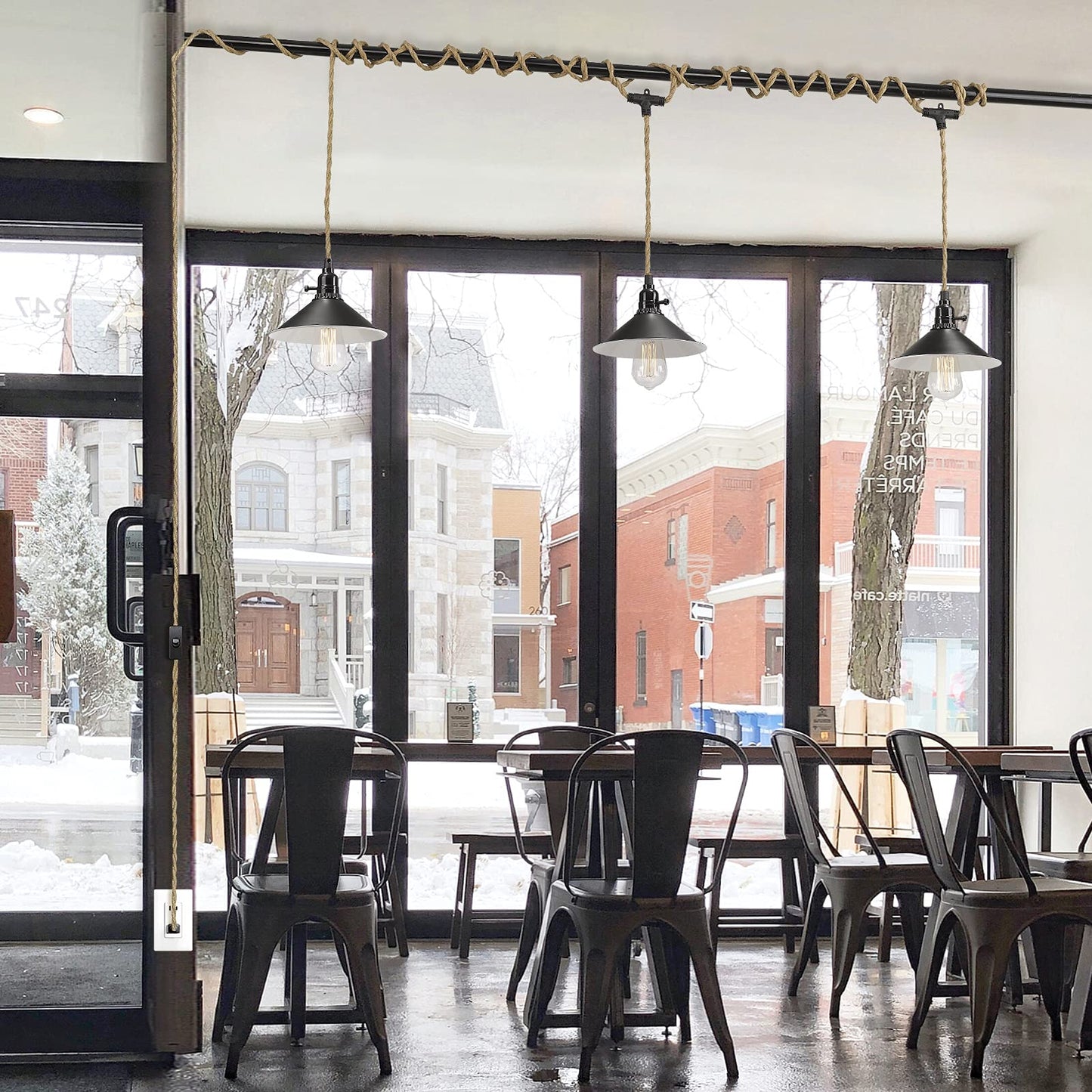 - Farmhouse 3-light hanging light with plug in cord features 3 metal shades in a black finish, with 29FT adjustable twisted hemp rope to suit the needs of your space