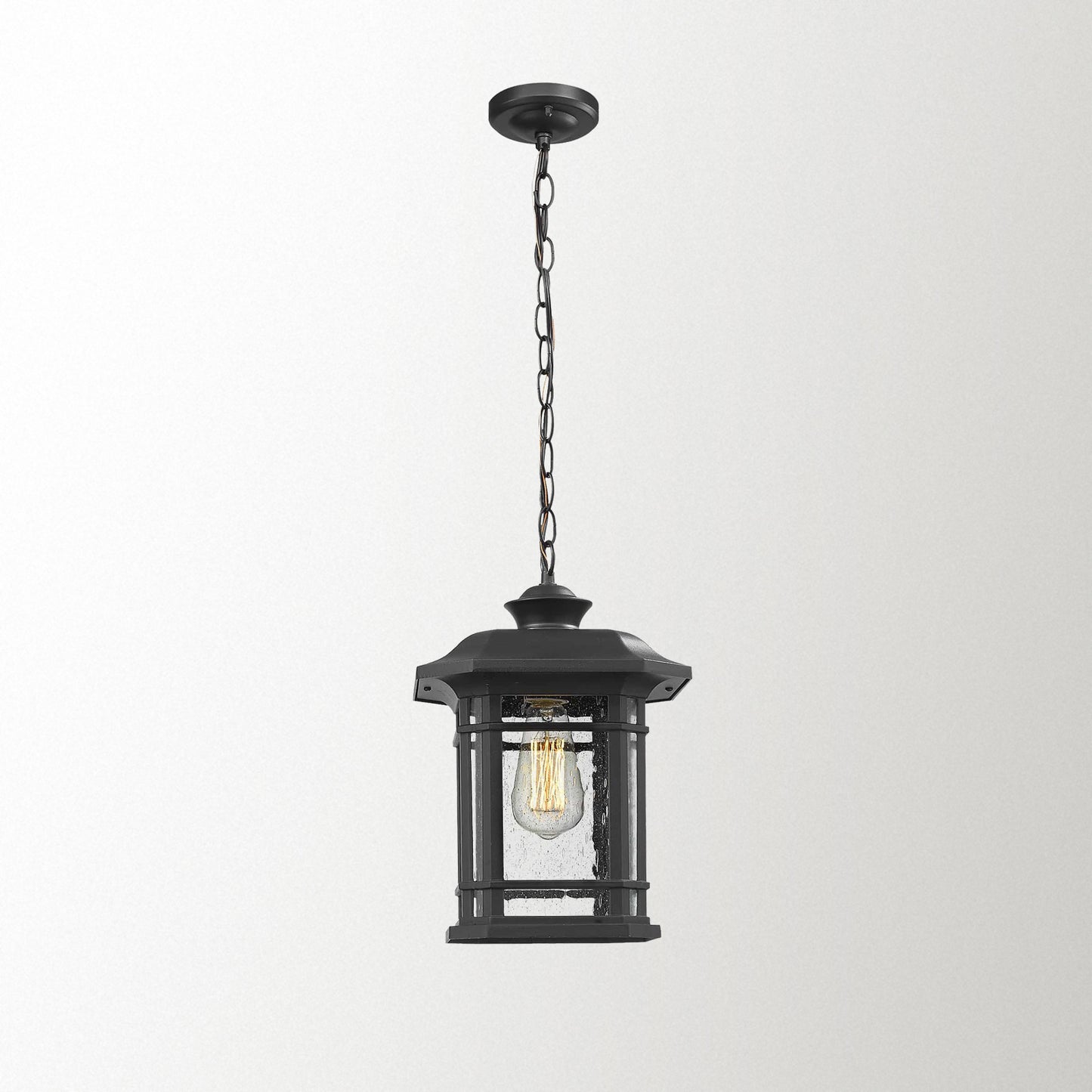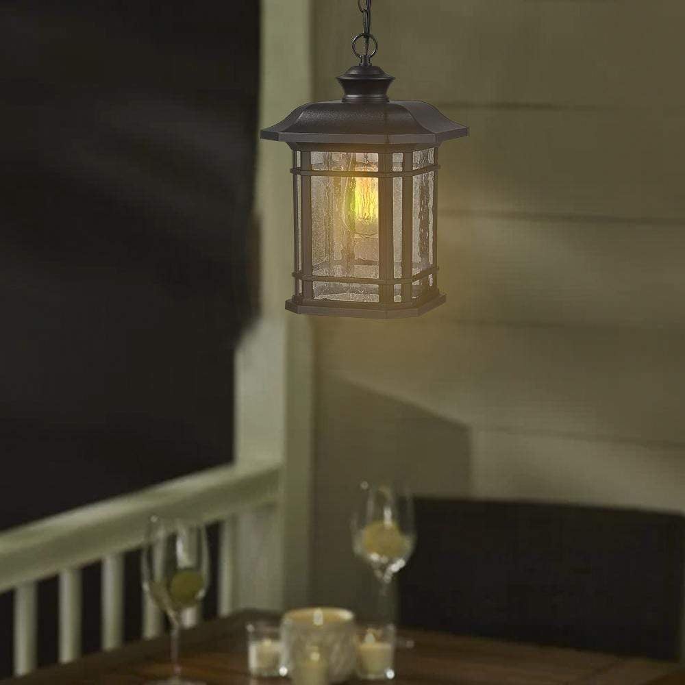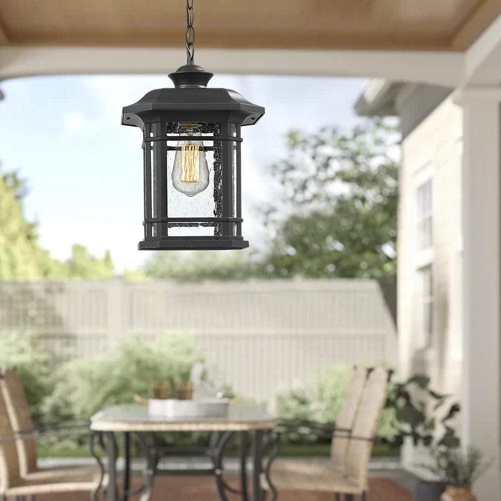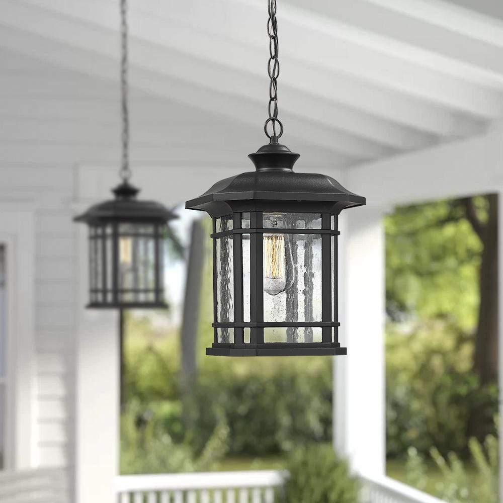 Regular price $99.99 USD- Weather resistant and suitable for wet locations, this outdoor pendant lighting features sturdy aluminum construction and seeded glass in black finish