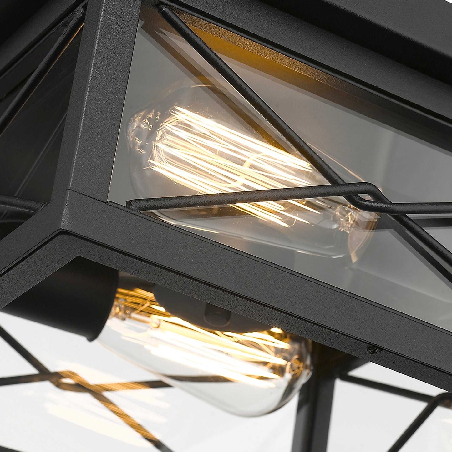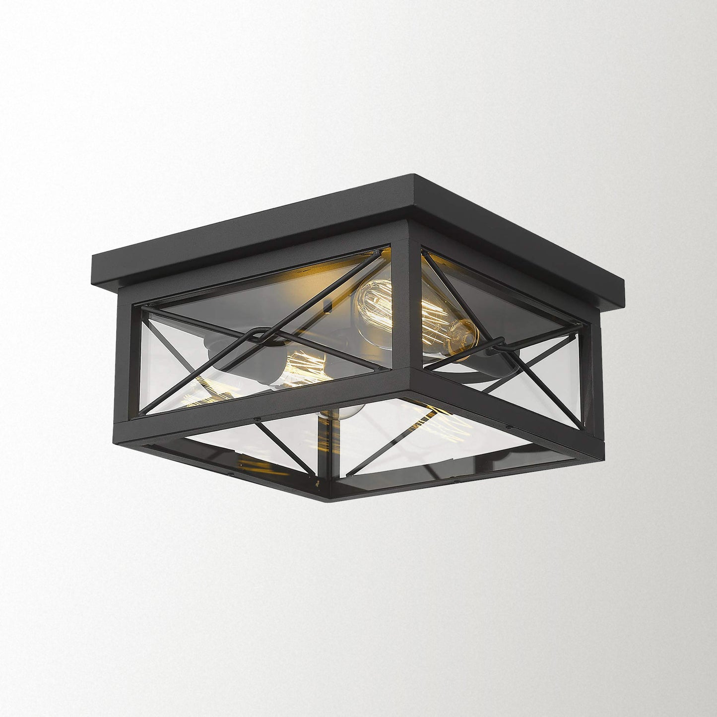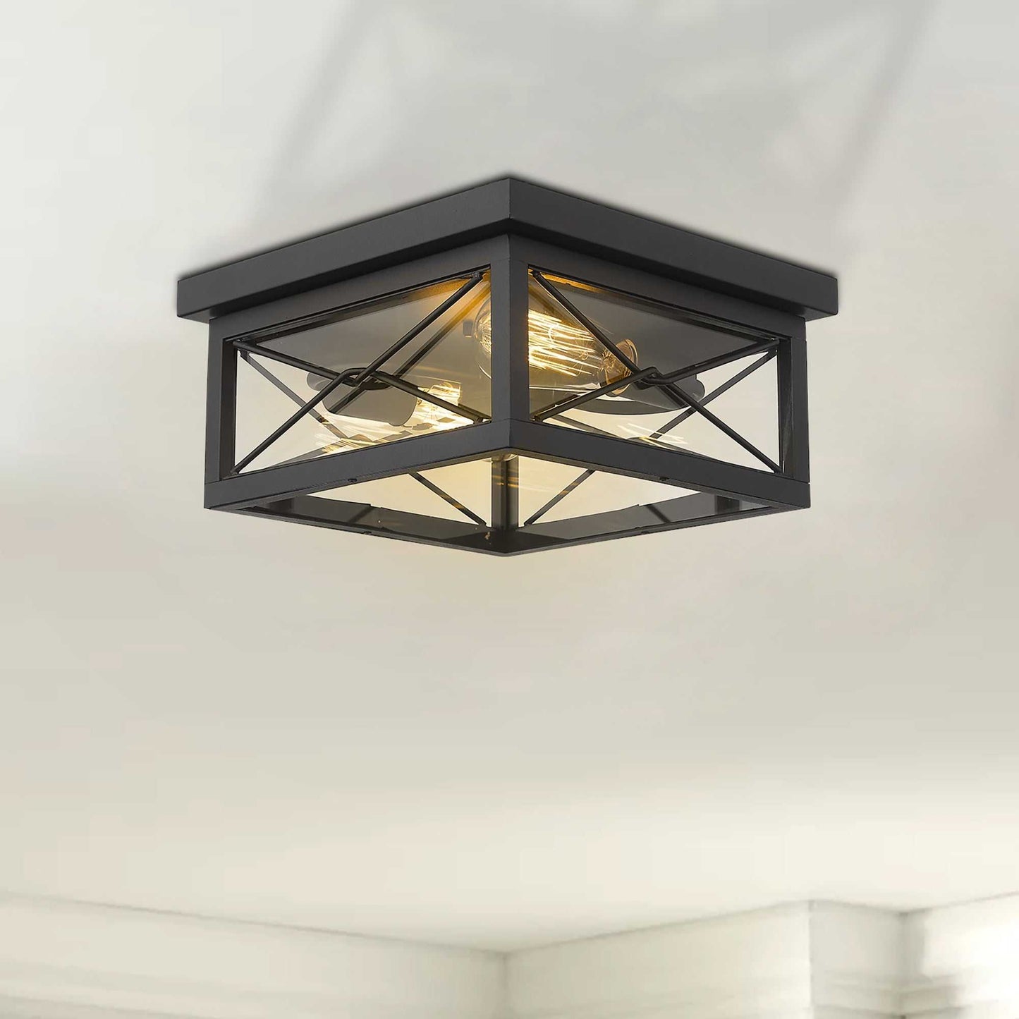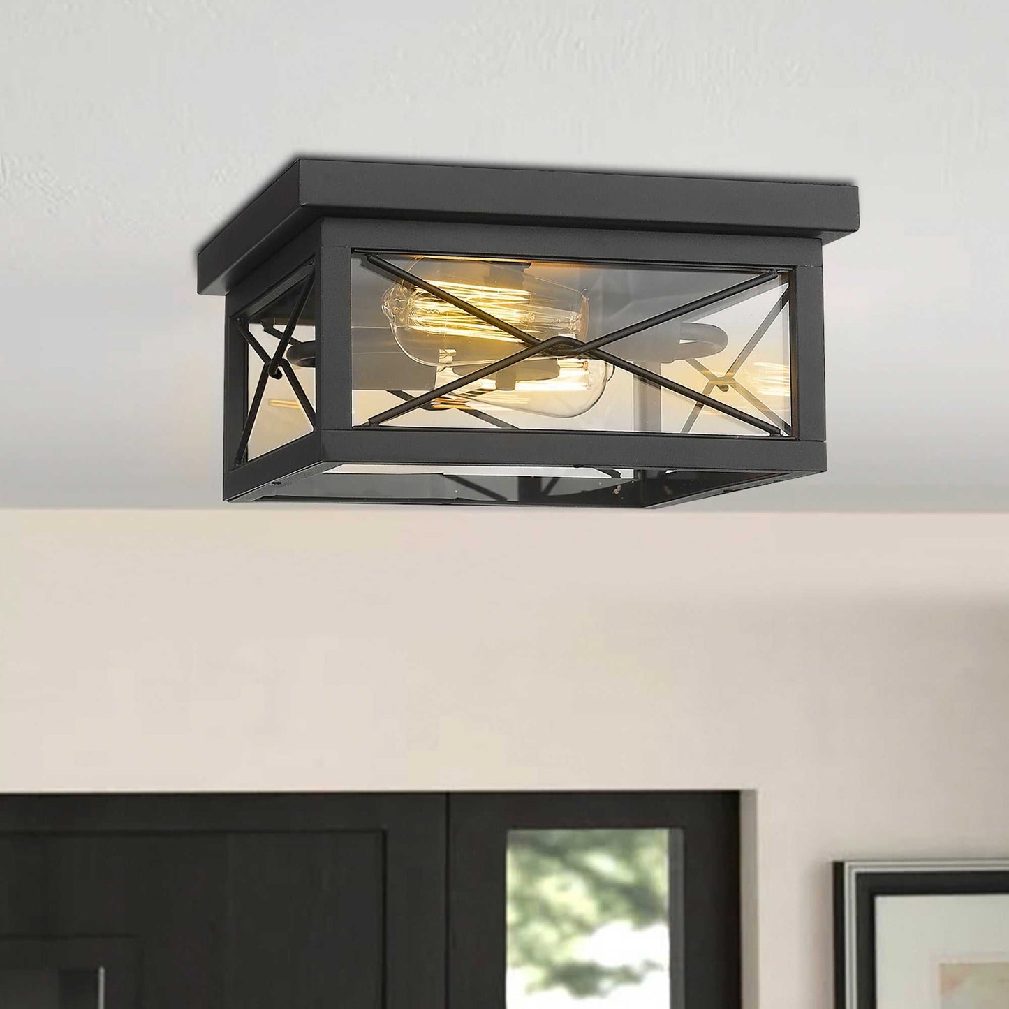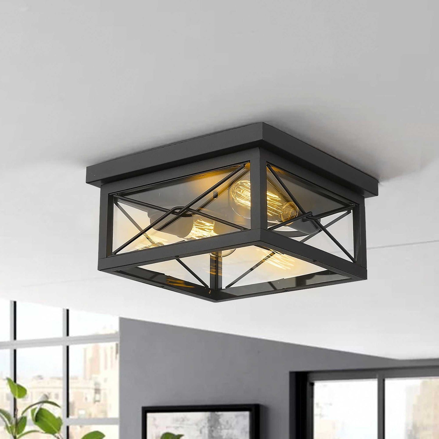 - Ceiling Light. Farmhouse flush mount ceiling light features a metal cage, with clear glass shade, in a black finish
